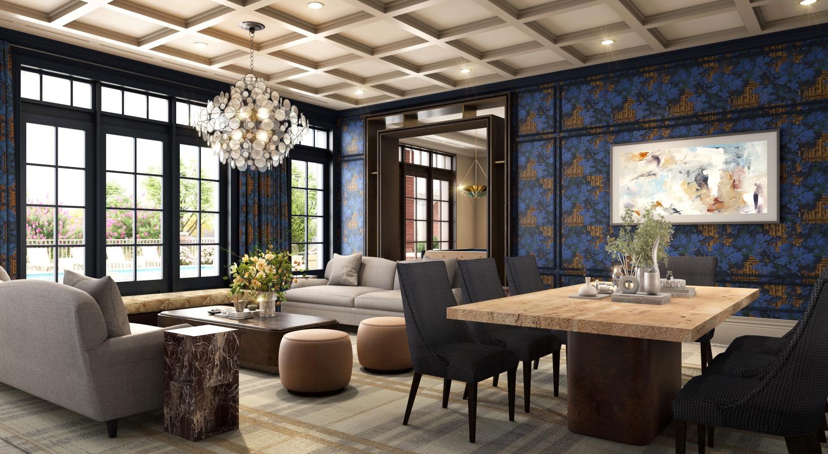• a room with a table chairs large windows with a large painting
