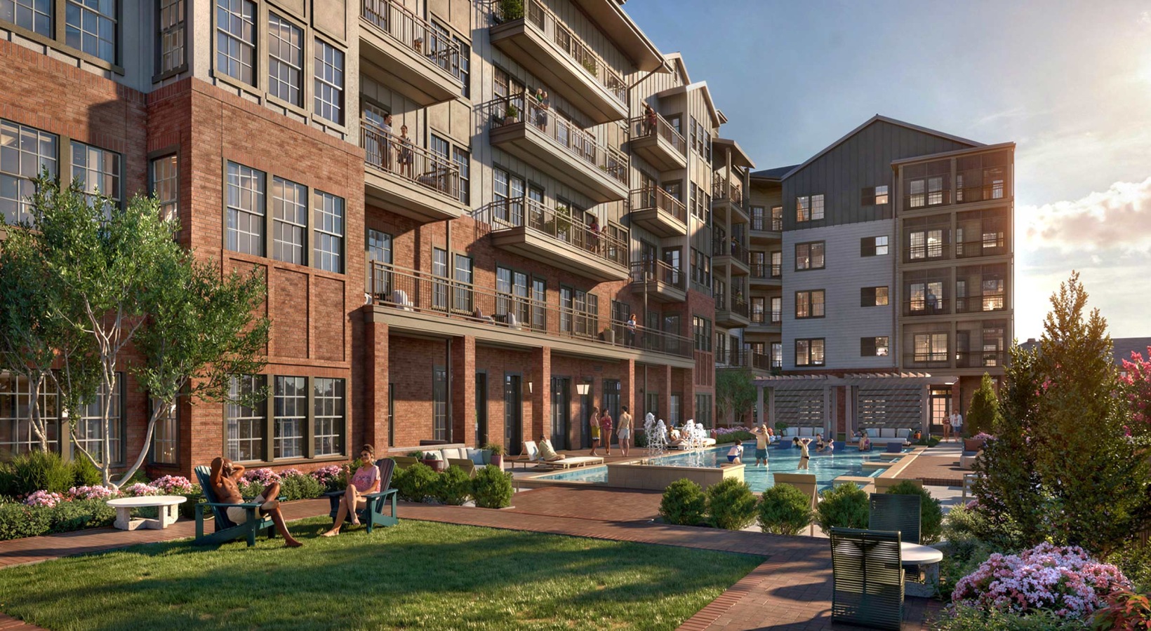 • The Linden's central pool and lawn, connected to fitness center, coworking lounge, and clubhouse