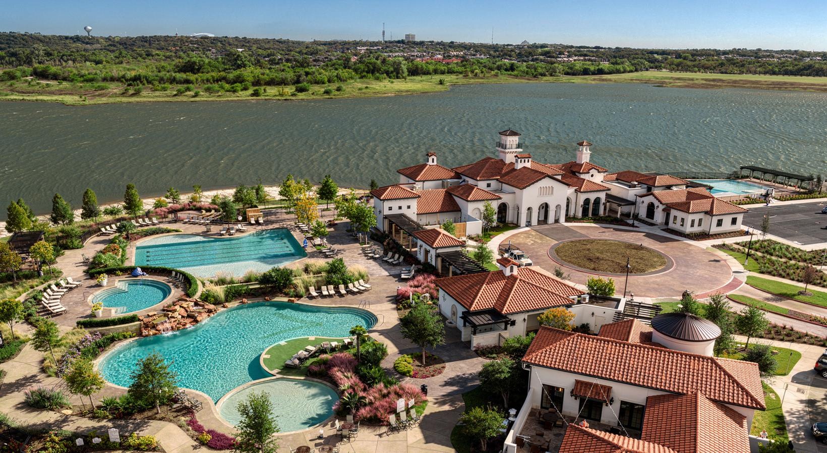 • a high angle view of a resort with pools and body of water