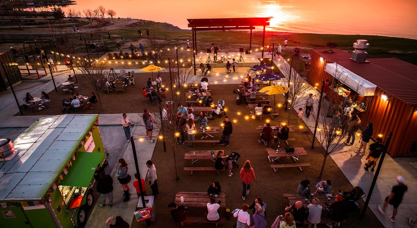 • a group of people at an event outdoors at dusk